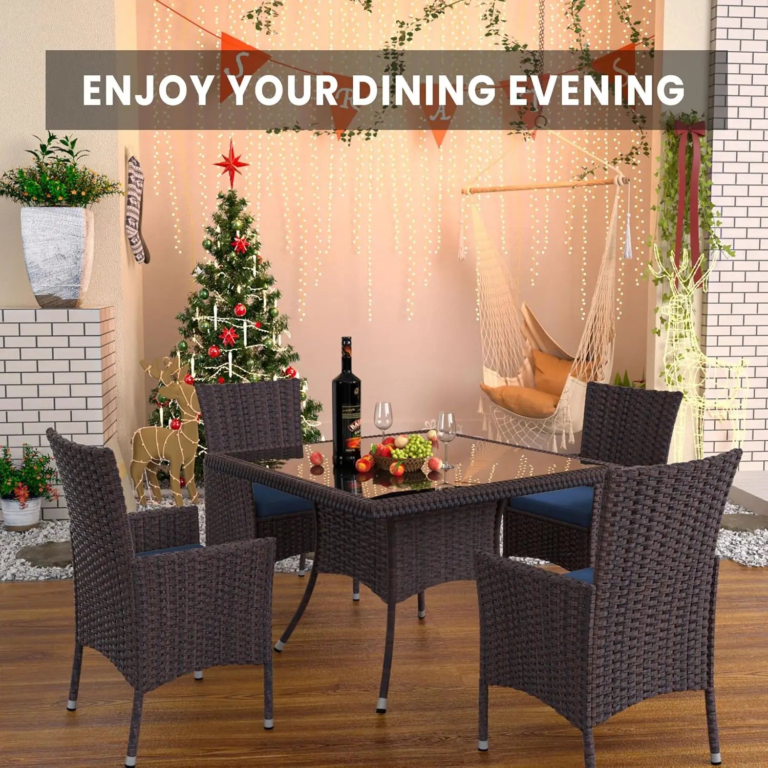 Transform your outdoor space into a serene oasis with the 5 Piece Rattan Patio Dining Set, featuring plush cushions and elegant navy blue chairs. Crafted for comfort and style, this stunning patio set from Fabulous Home Goods combines modern aesthetics with exceptional durability.