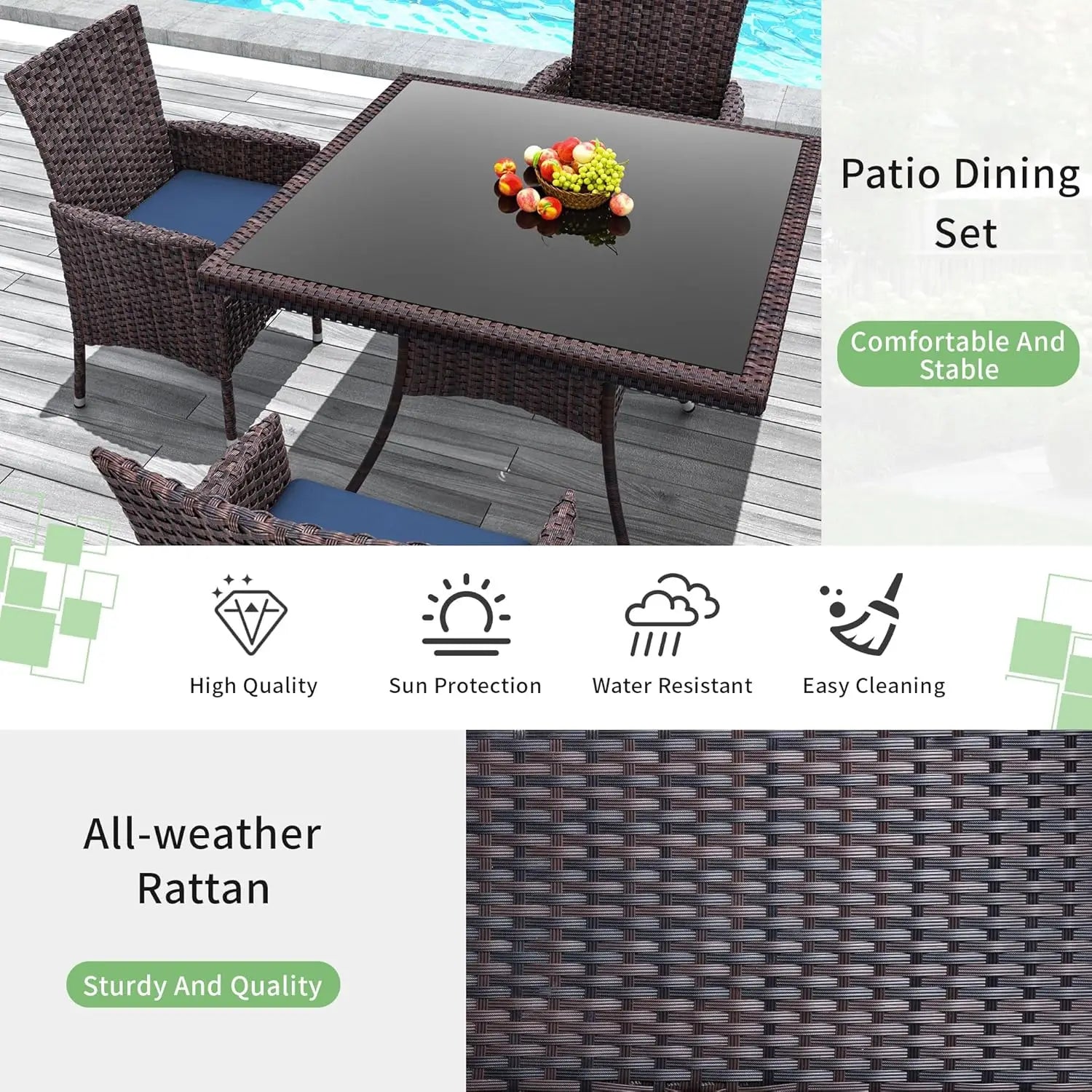 5 Piece Rattan Patio Dining Set with Cushions and Navy Blue Chairs