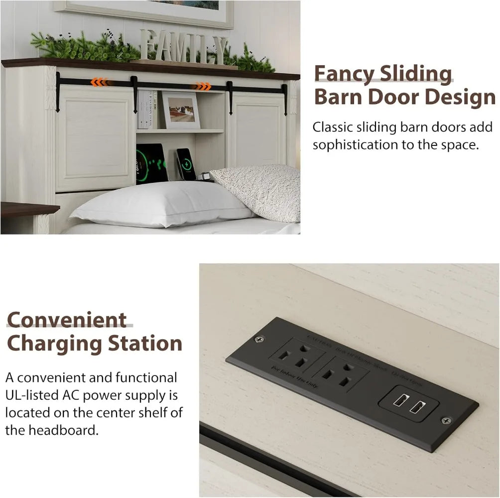 Antique White Queen Bed Frame with Storage Headboard and Bookcase