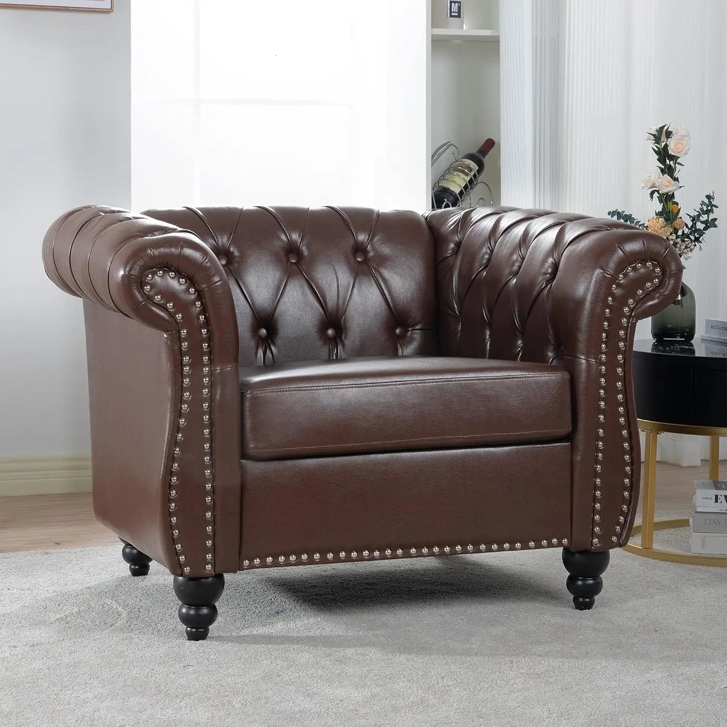 Crafted with meticulous attention to detail, this tufted upholstered armchair showcases luxurious dark brown leather that not only exudes sophistication but also offers exceptional durability. With its rolled arms and exquisite tufting, this chair is designed for both comfort and style.