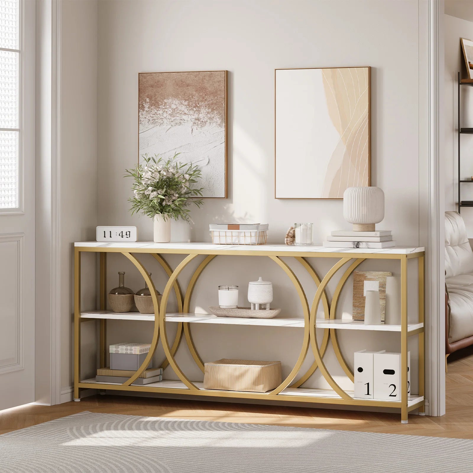 Transform your living space with the Modern 70.8 Inch Console Table with 3 Tier Storage Shelves from Fabulous Home Goods. This exquisite table blends a sleek modern style with practical functionality, making it the perfect addition to any room in your home. With its elegant white and gold design, this console table not only offers ample storage but also acts as a stunning centerpiece.