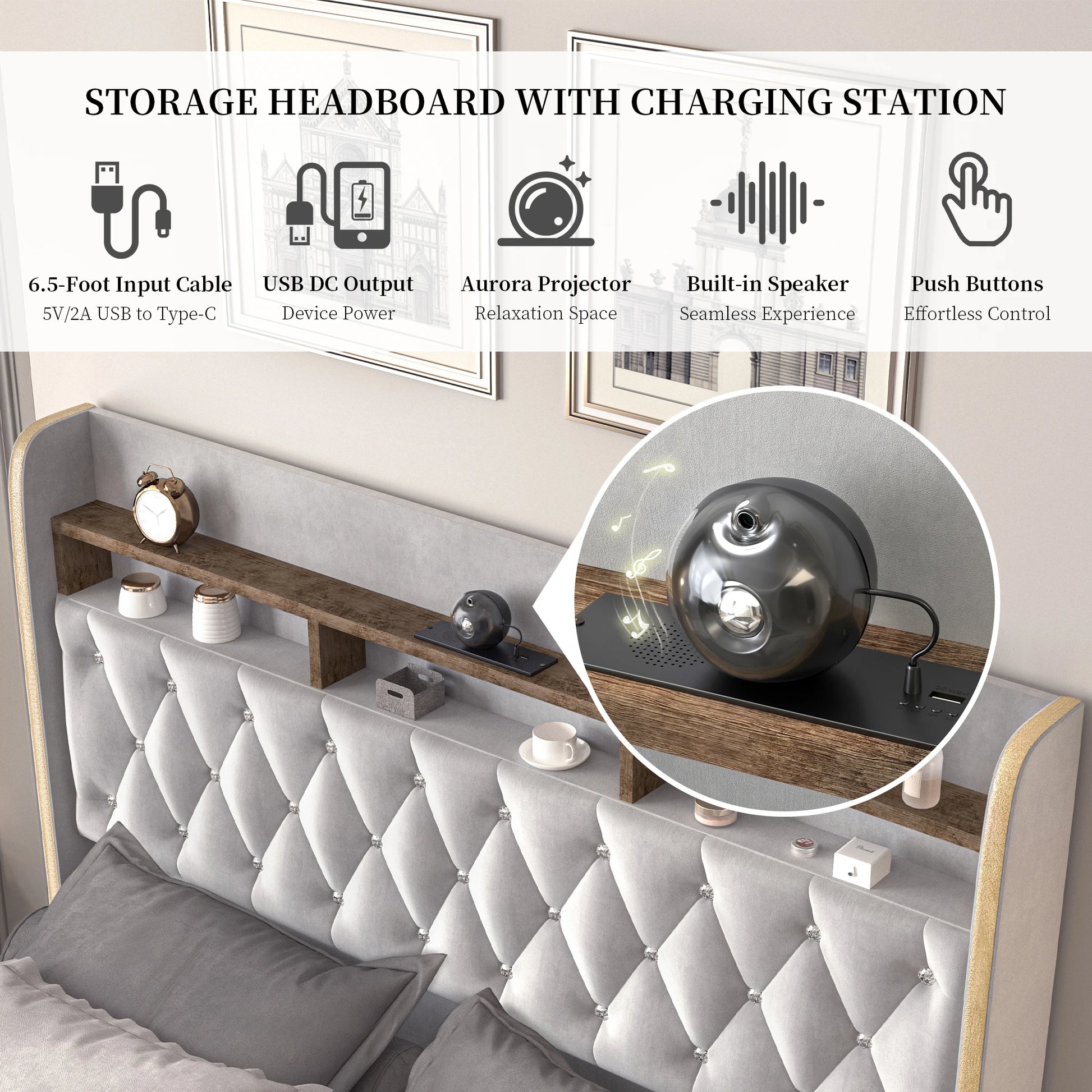 Transform your bedroom into a sanctuary of style and comfort with the Queen LED Bed Frame with Storage and Star Projector from Fabulous Home Goods. This modern bed frame boasts a stunning velvet surface, providing not only an exquisite aesthetic but also unparalleled comfort. Crafted from high-quality wood and upholstered in luxurious PU velvet, it offers both durability and elegance.