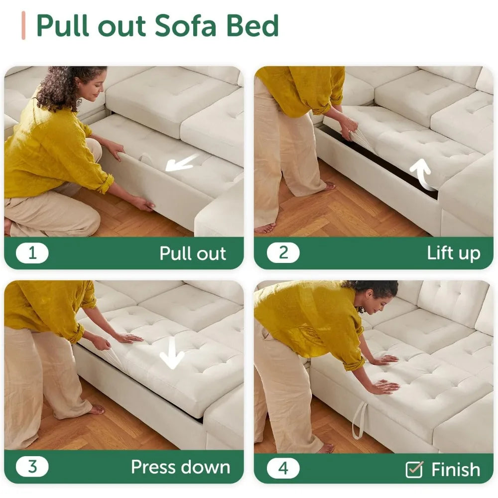 Beige U Shaped Sleeper Sectional Sofa With Storage Chaise